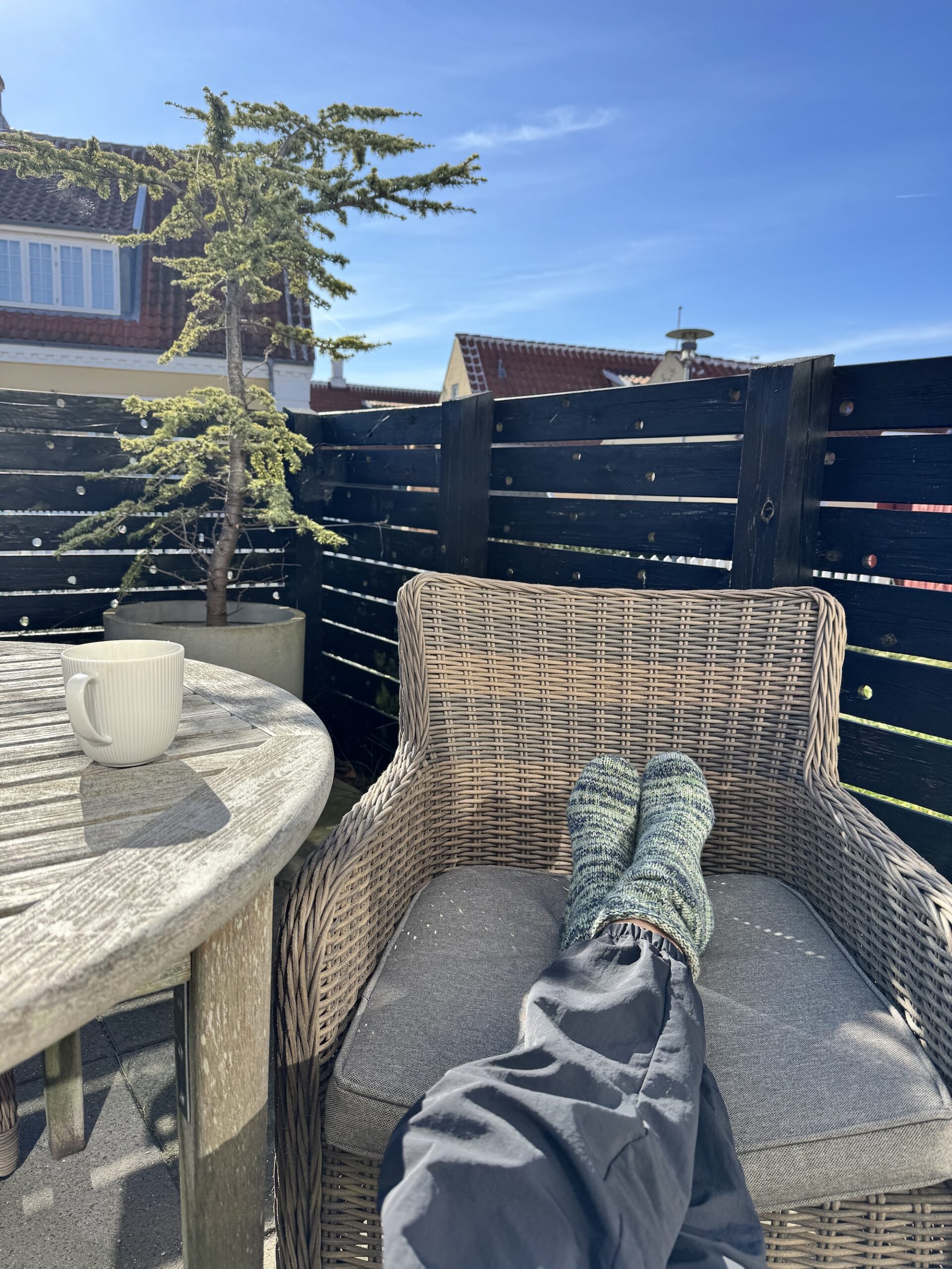 Udearealet på 115 m2 er delvist flisebelagt, delvis beplantet med marehalm og har flere solrige kroge med borde, stole og liggestole.